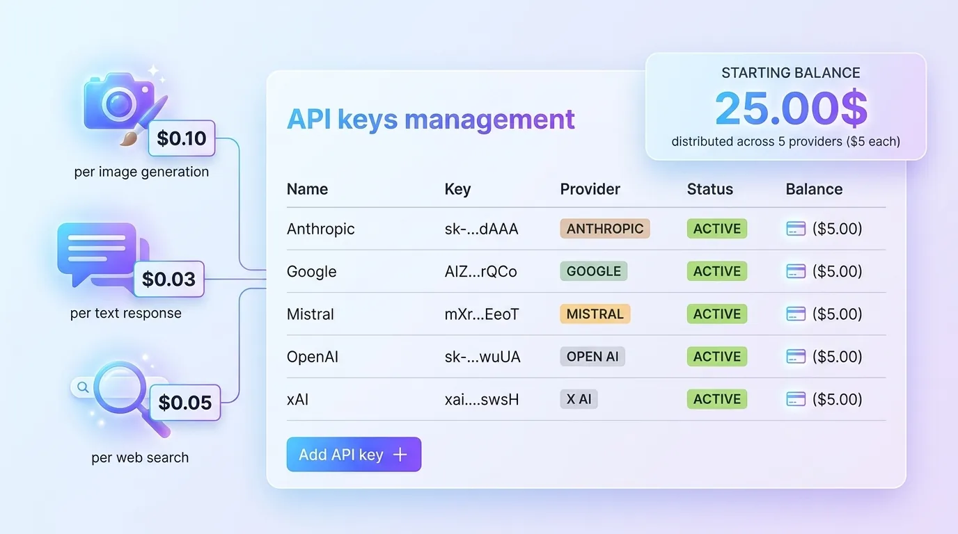 Just works with five providers: Anthropic, OpenAI, Google, xAI, and Mistral. New installs start with $25 in onboarding credits distributed across providers, so you can run real workflows before committing to any API key setup.