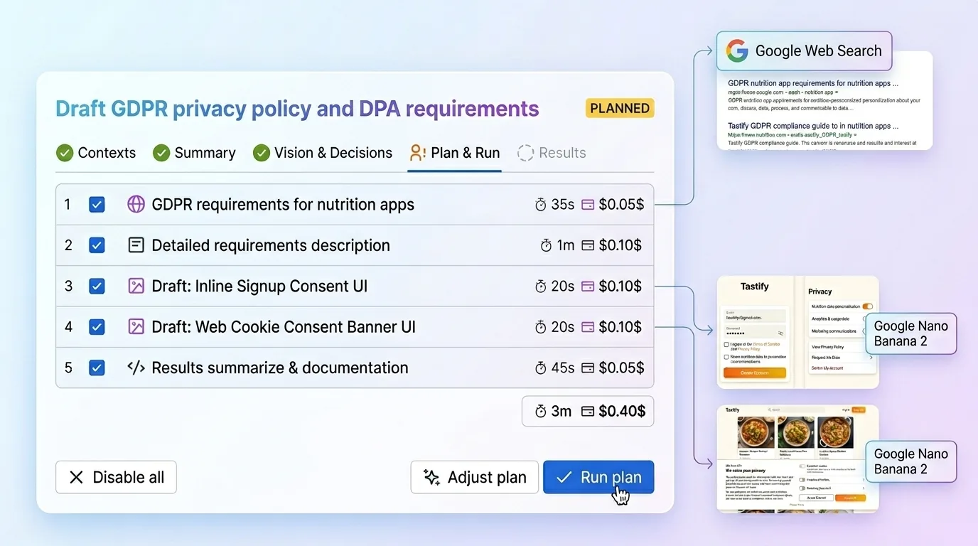 The $1 price was honest at the time it was set. Just was experimental. None of what is described above existed in it. A product that asked clarifying questions, ran live research, generated images, accumulated feedback, supported reusable scenarios, and let teams control context scope at project or organization level was the roadmap, not the release.