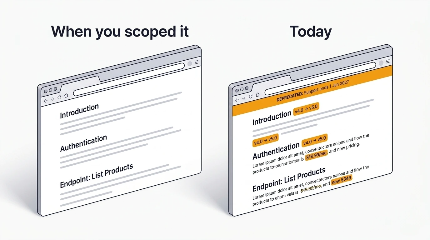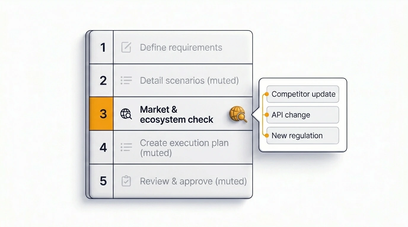 Non è un'ipotesi. È lo standup del martedì a metà sprint. Qualcuno nel team menziona un'API che si comporta diversamente da come il ticket descrive. Un'altra persona apre il changelog di un competitor e scopre che hanno rilasciato quasi la stessa funzionalità tre settimane fa. Il ticket andava bene quando è stato scritto. Il mondo si è semplicemente mosso prima che il sprint iniziasse.