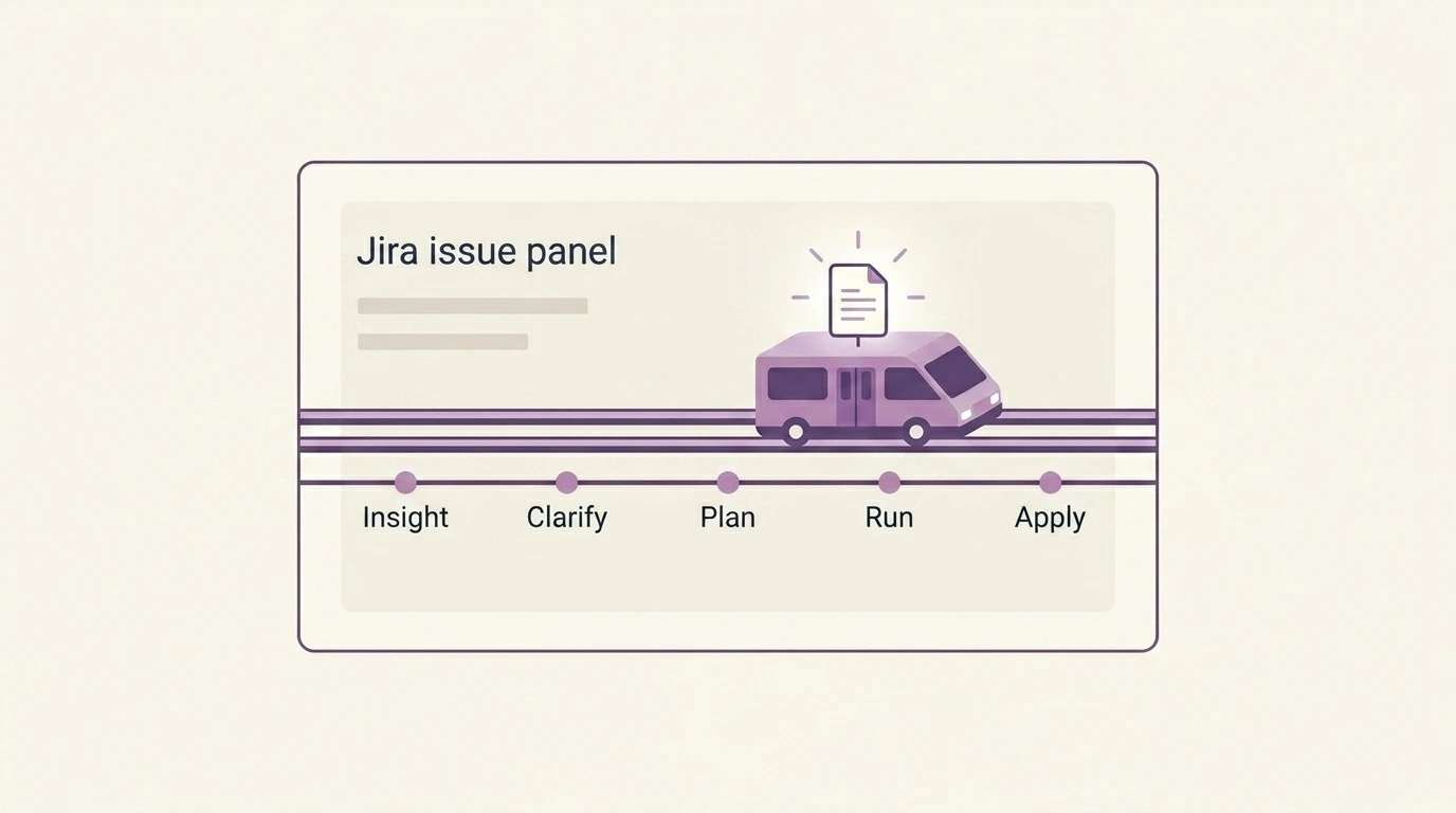 Just идёт по третьему пути. Это приложение для Jira на Forge, которое встраивает ИИ прямо в панель задачи — не как боковой чат, а как структурированный жизненный цикл: инсайт, уточнение, планирование, выполнение и запись результата обратно в поля Jira.